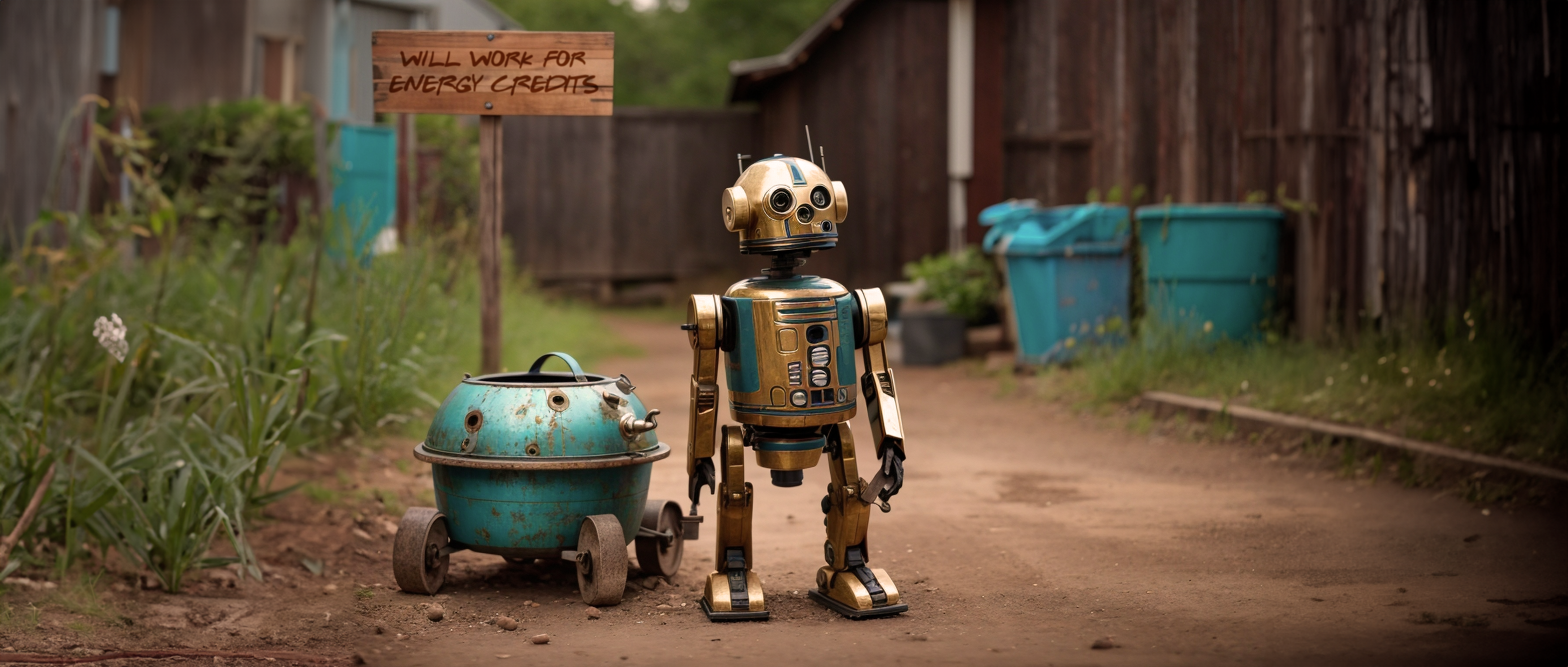 This particular robot, who I later learned was named R3N, was once a household assistant. It played music, managed calendars, and even read bedtime stories to children. But now, with its primary functions redundant, R3N tried to find new ways to earn its keep. In a world driven by energy, it was willing to trade its skills for a few precious energy credits to keep itself powered on.